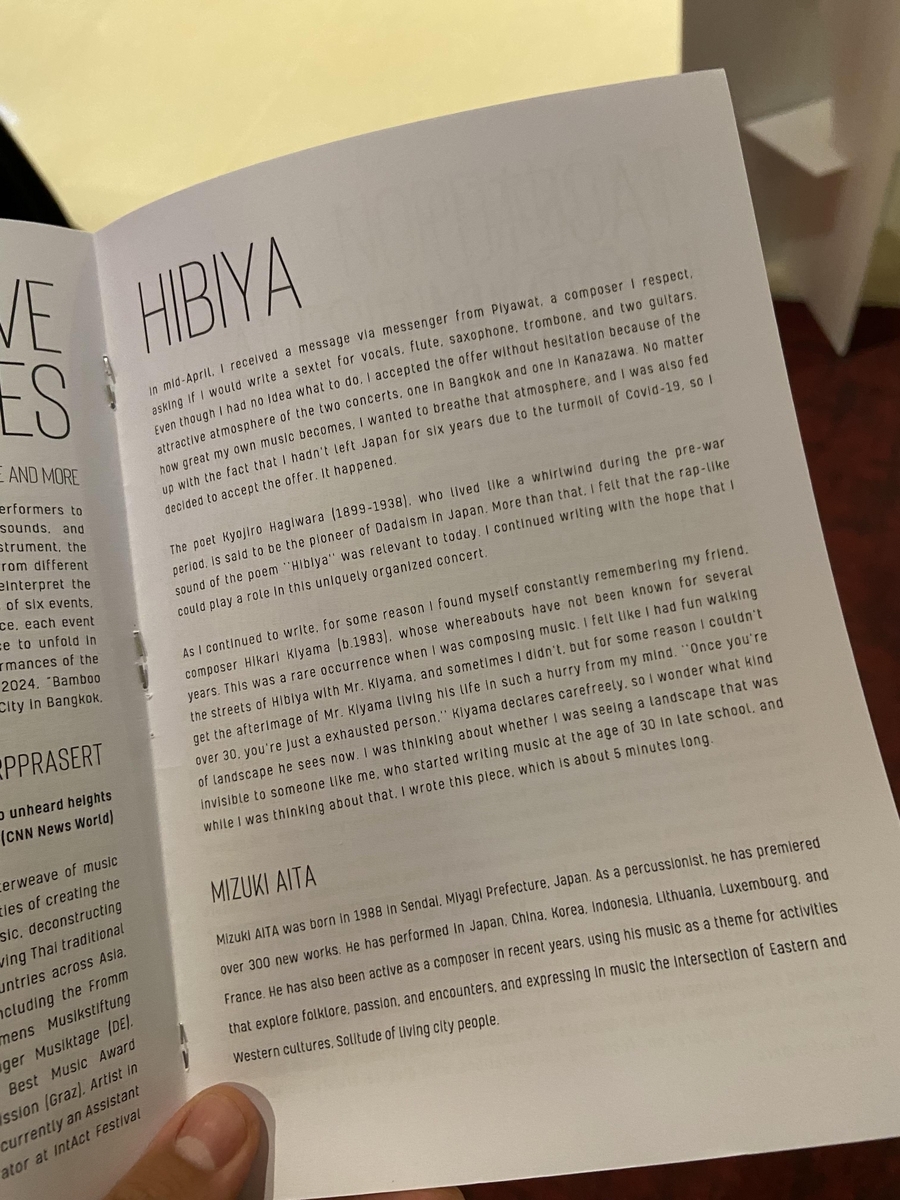 一方この日、Piyawatはプロデューサーとしての役割を一手に担い、自らの楽曲は出さなかったことも大いに興味深かった。個人的には今回の滞在で彼の曲を実演でもっと聞きたいと思っていたが、「自分だけではなく、若手や様々な世代に場を提供する」という音楽全体を見つめる姿勢は大いに敬服しなければならないことだと思った。音楽業界全体が盛り上がることで、社会と密接に関わることができる、というPiyawatの哲学をそこに垣間見たような気がしたのである。それは、僕が《Hibiya》を書いていた時に、「30を過ぎてしまえば、才能が枯渇したただの人だ。」と屈託無く宣う木山さんが、継続して音楽ができる場が、必要だったのではないかという、僕自身の、社会全体への、問いかけのようにも思えたのだった。